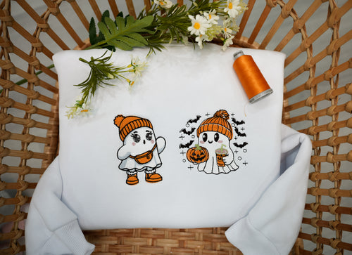 Besticktes Halloween Sweatshirt – Geist mit Kaffee & Fledermaus – Gemütlicher Herbstpullover