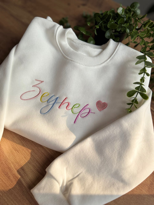 Kinder Sweatshirt bestickt mit Namen & Herz – personalisiert & handgemacht